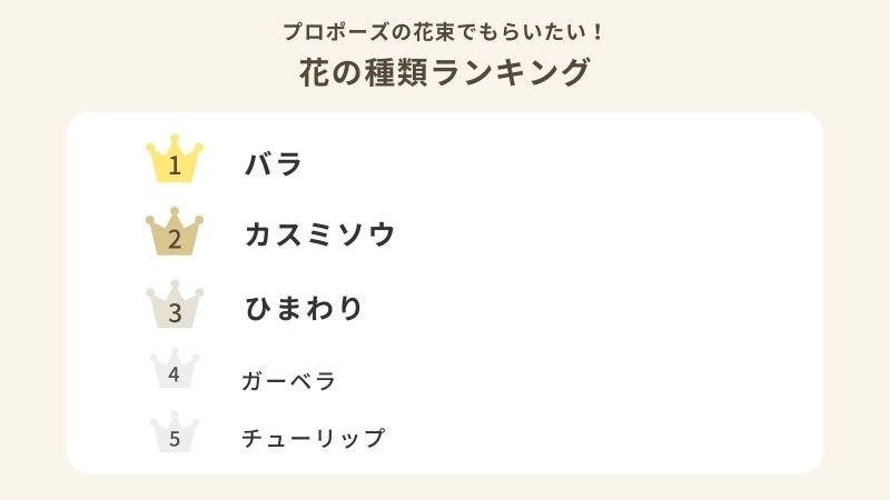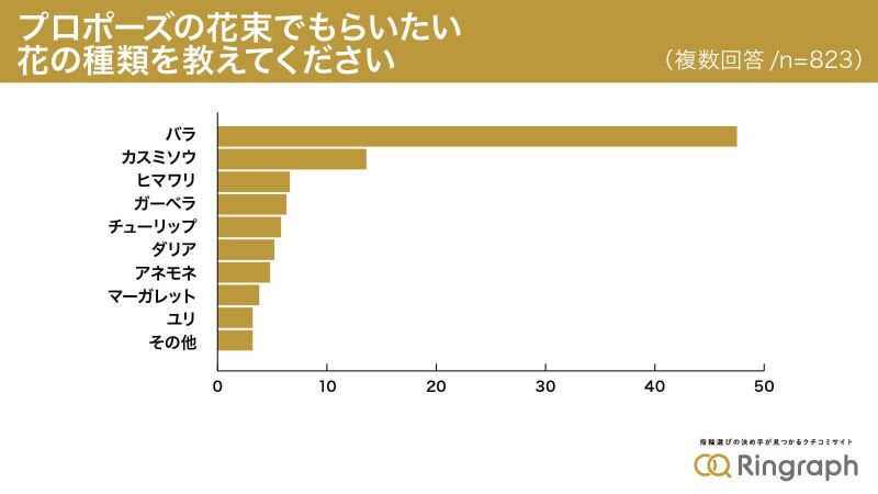 続いて、プロポーズで花束をもらうとしたら、どの花の種類がほしいかを調査。プロポーズでもらいたい花の種類は、圧倒的に「バラ」が人気となりました。