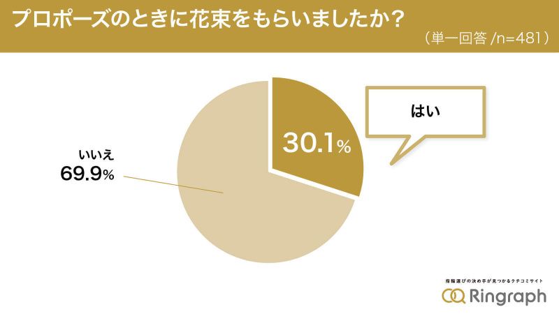 次に、実際にプロポーズのときに花束をもらった女性はどれくらいいるのかを確認したところ、約3割の方が「花束をもらった」と回答。