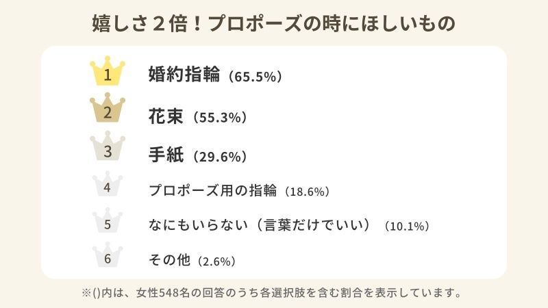 プロポーズのときにほしいものを聞いたところ、「婚約指輪」がもっとも多く、2番目に「花束」が多い結果に。