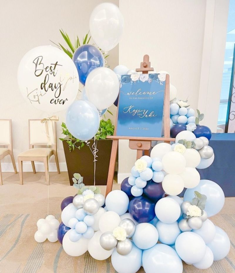 ボリュームのあるバルーンや「Happy Wedding」「Best Day」など、文字入りの風船を組み合わせたデザインは華やかなだけでなく、非日常的でゲストの気分を高めることもできます。