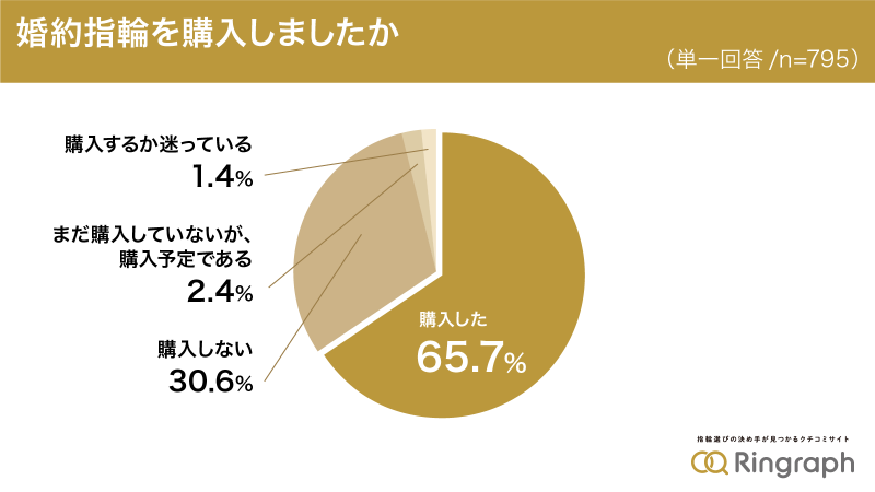 Ringraphのアンケート調査によると、実際に婚約指輪を購入した先輩カップルの割合は65.7%でした。