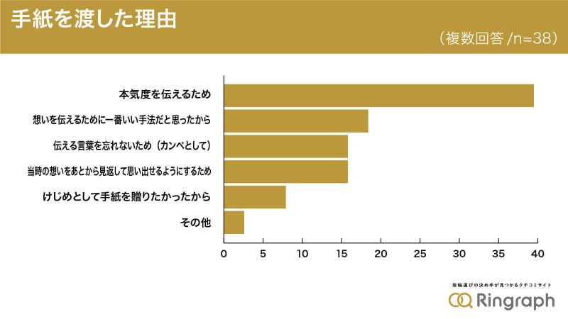 次に、プロポーズで手紙を渡した方に手紙を渡した理由を聞いたところ、「本気度を伝えるため」という理由が約4割!
