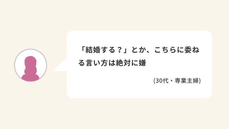 亭主関白系とほぼ同数の回答が集まったのは「結婚する?」や「結婚したい?」など相手に決断を委ねるようなセリフ。