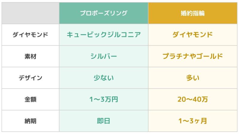 婚約指輪はダイヤモンドの品質にもこだわりのある商品が多い一方、プロポーズリングは、ダイヤモンドの代わりにキュービックジルコニアなど安価な石が使用されます。
