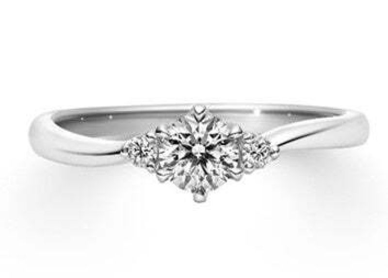 両サイドに輝く2粒のメレダイヤモンドと絞りのデザインが、センターを際立たせます。