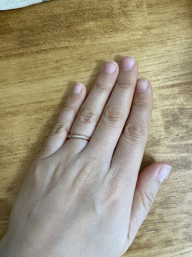 素材もイエローゴールド、ピンクゴールド、ペールブラウンゴールドと試して、1番自分の指にしっくりくるピンクゴールドにしました。