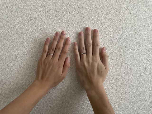2人で「シンプルなデザインがいいね!」という思いから始まった指輪探し。シンプルな指輪はどこのお店にもあるからこそ、アフターサービスと付け心地に拘りました。似合う指輪の診断もしてくれるので、納得のいく指輪選びができました!