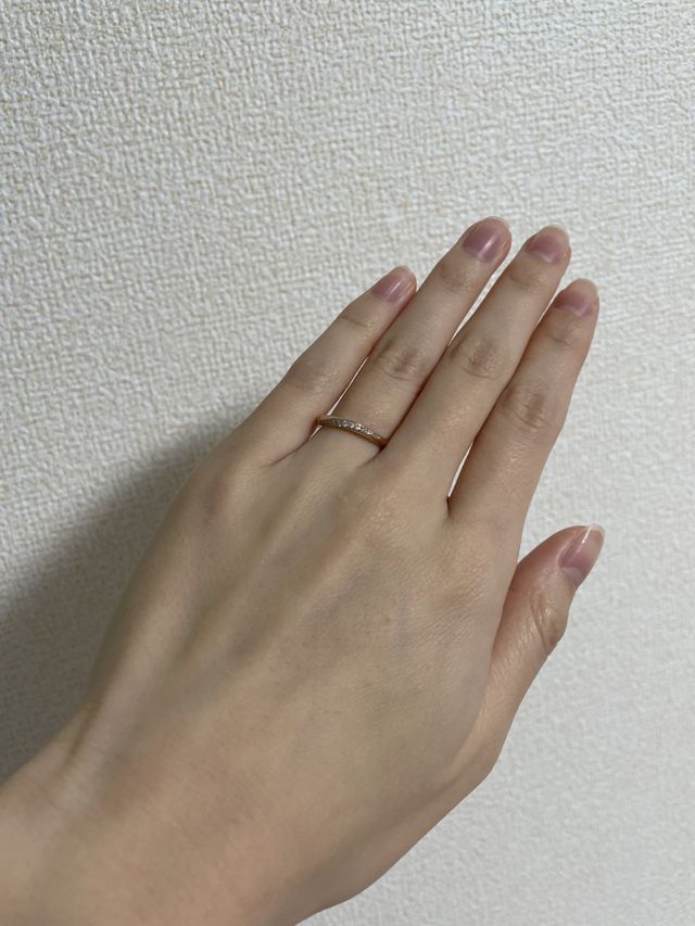 ピンクゴールドの結婚指輪を探していましたが、ブランドにより色味も少し変わってくるので好みのピンクゴールドで良かったです。彼とはペアのものではないですが、ウェーブのデザインでペア感を出しつつお互いが好みのデザインを選ぶことができました。