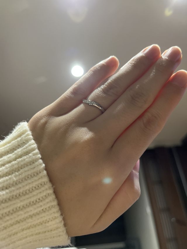 指輪それぞれに込められた意味がとても素敵だったのと、形や色味のおかげで飽きがこないデザインなのが良いなと思いました。ストレート型よりも指が細く見えるところも決めてでした。センターダイヤもギラギラしすぎてなくて、毎日つけても派手に見えなくて仕事中も着用しやすいです。