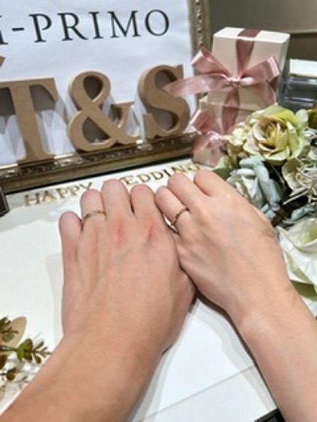 ペアのリングに見えますが、似たようなものの中でお互いが似合うものにしました。私のは少しウェーブしているところがポイントです。さりげないダイヤが気に入っています!
