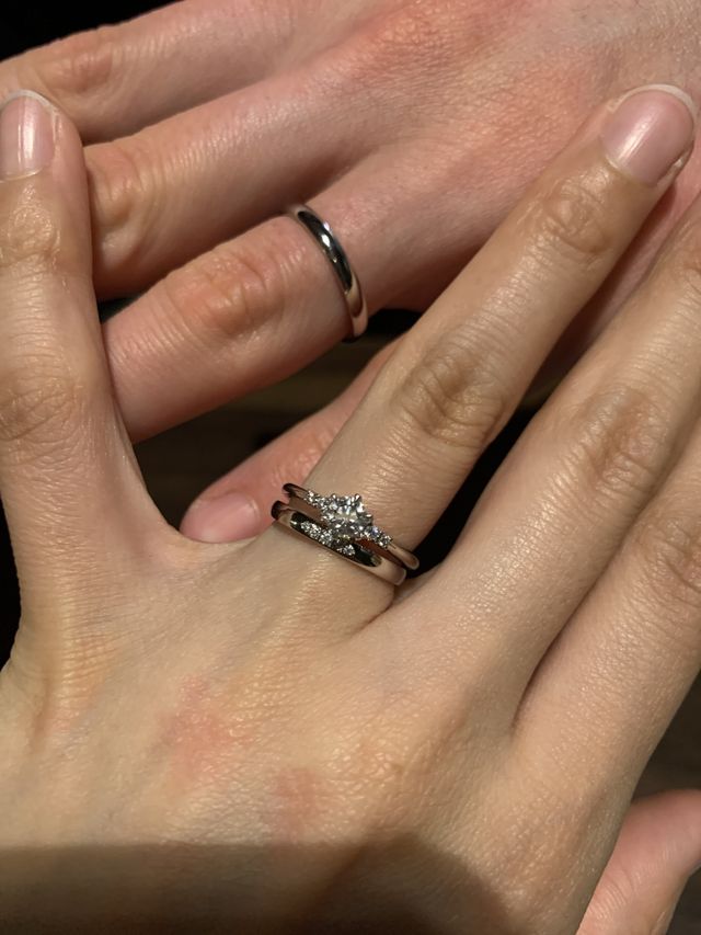 結婚指輪は普段付けでき、かつ、長い年月が経っても付けられるシンプルなデザインにこだわりました。また、シンプルな中にもダイヤモンドの輝きがあり美しく、何度も指を見入ってしまうデザインになっています。肌色がイエベ春の私ですが、付けてみるとシルバーも肌馴染みが良く、気に入っています。