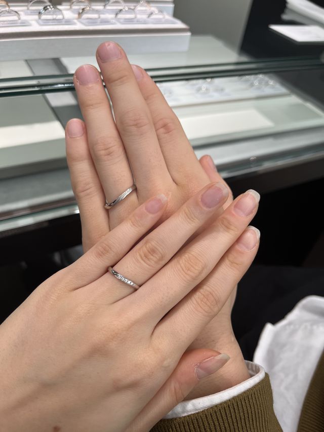 パーソナルハンド診断により、ウェーブの形が似合うとのことだったので、試着しました。ただ、ウェーブといっても緩めのものだったので、ストレートが気になってた私でも好みのデザインでした。男性のもウェーブかかってて、ペア感がでてていいなと思いました。