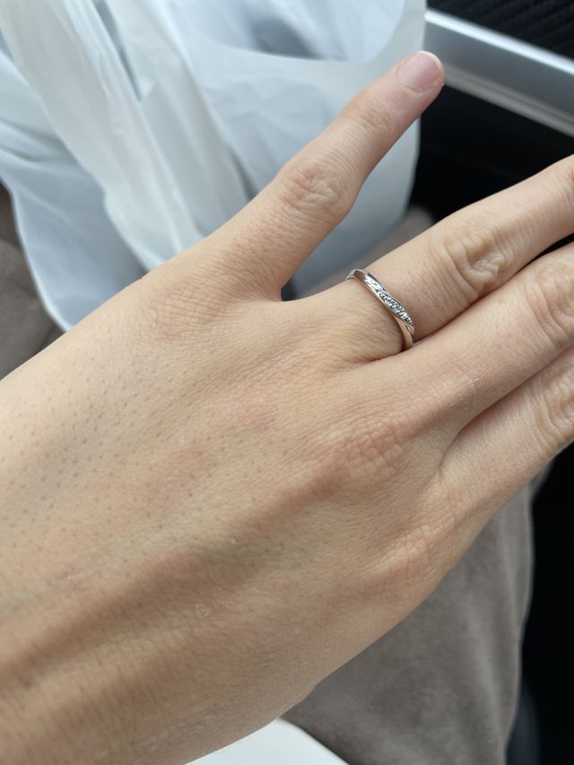 指輪を選ぶ際に指の形を調べて、自分に合うデザインや形、普段着る洋服の雰囲気からも最高の指輪を選んで下さるところが良い。