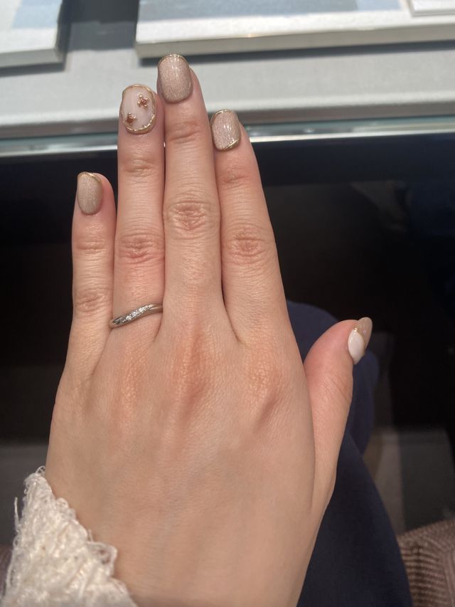 自分の手に似合う指輪と診断されたものをまずは試着しました。他にもたくさん試着させていただいたのですが、写真を撮るのを忘れてしまいましたが、派手すぎず自分の手にあったウェーブのデザイン、つけた後に自分の手を見つめていると老後が思い浮かぶ長く使えるデザインだと感じたことが決め手です。