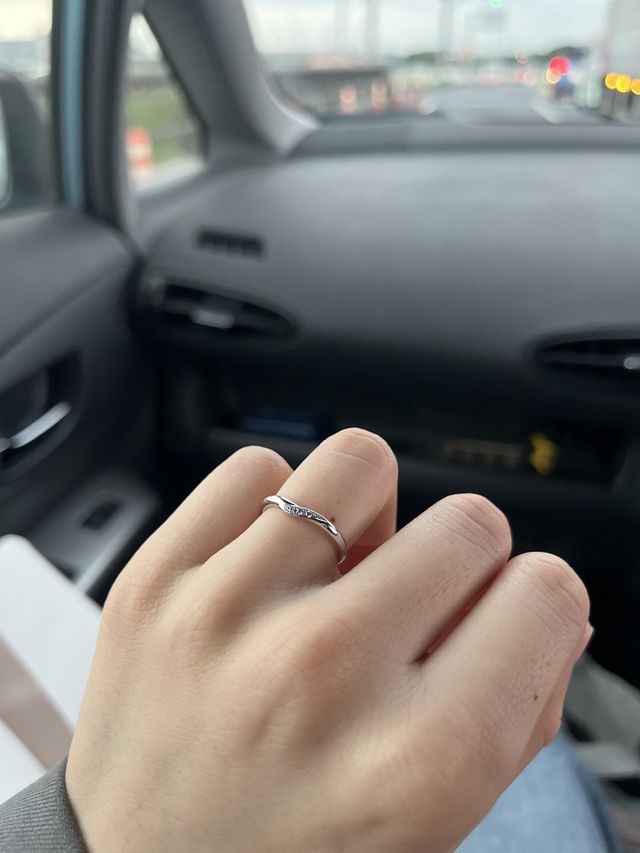 指が綺麗に見えるデザインにしました。ダイヤが入っていることで指に華やかさをプラスしてくれます。Vらいんがあることで指が長く見える効果があるそうです。ガッツリしたVではなく緩やかなウェーブでかわいらしいです