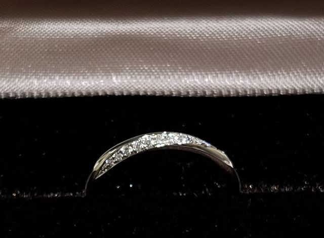 ダイヤモンドがたくさん使われていて、どこから見ても綺麗に見えるところがとてもお気に入りで、家族や友人からもたくさん褒めてもらいました。つけ心地もよく、つけはずしもしやすいサイズにしてもらいました。一生大切に使います。
