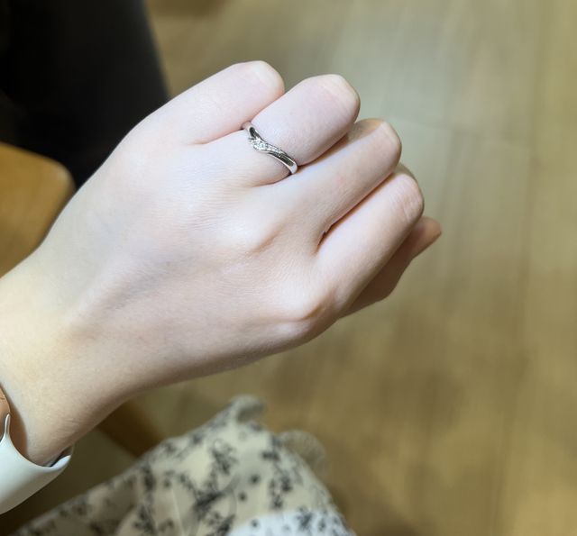 指の形に1番似合っていて、指が綺麗に見えます。デザインも特徴があって、個性しすぎないです。ダイヤが輝いてテンションがあがります。値段も予算内に抑えています。1回見に行ってから数ヶ月経ったあともやはりこちらのデザイン1番気に入っています。