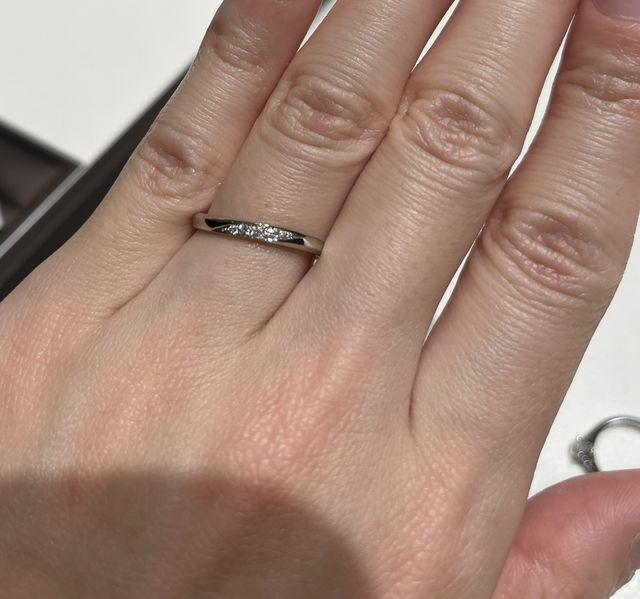 ダイヤがついているデザインで、シンプルな指輪を探していました。結婚指輪はストレートタイプが良いと思っていましたが、いざ試着するとウェーブタイプの方が似合うことが分かり、ウェーブタイプでイメージに合うものを選びました。