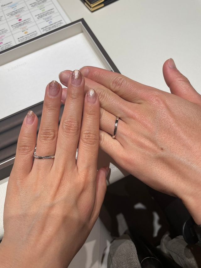 男性用指輪はシンプルながらもウェーブが入っており、そのウェーブのは入り方がちょうどよかった。女性用指輪についてもダイヤモンド10石入っているが付け方によってゴージャスにもシンプルにも見せれるようになっていた。