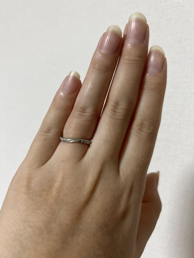 初めは線が真っ直ぐのシンプルな作りの指輪を検討していましたが、自分の指が細めのため、ゴツゴツした印象になってしまいました。