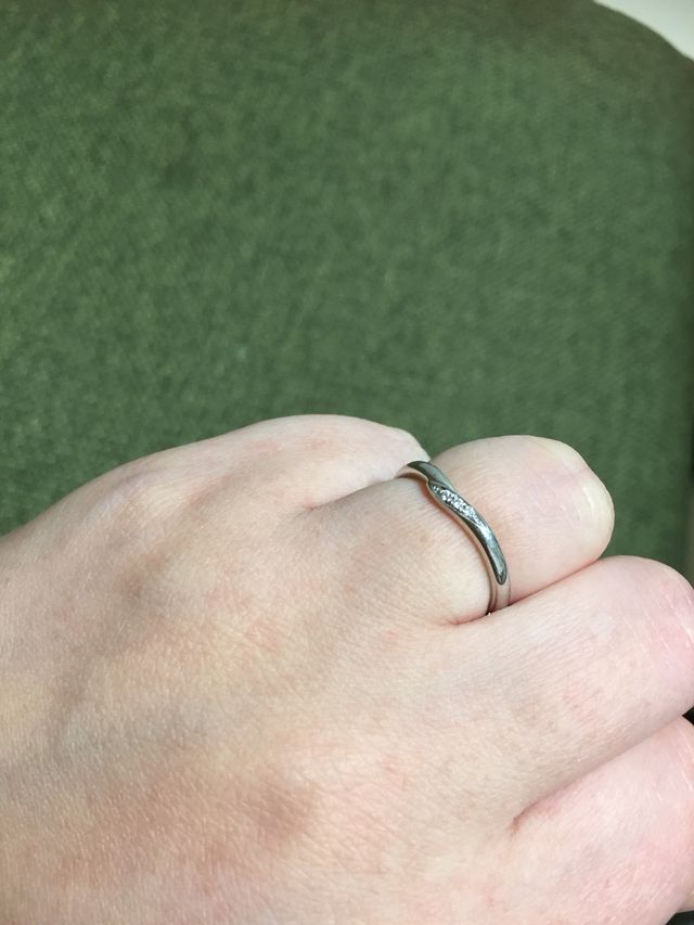 指が太いのがコンプレックスでしたが、V字のデザインなのでそのコンプレックスをカバーできるデザインを選びました。そして、小さいダイヤが付いているので普段使用してるときも常にキラキラしていて気持ちはいっ新婚気分です。婚約指輪と重ねてつけられるので、お呼ばれのときなどのここぞという時にも使えます。