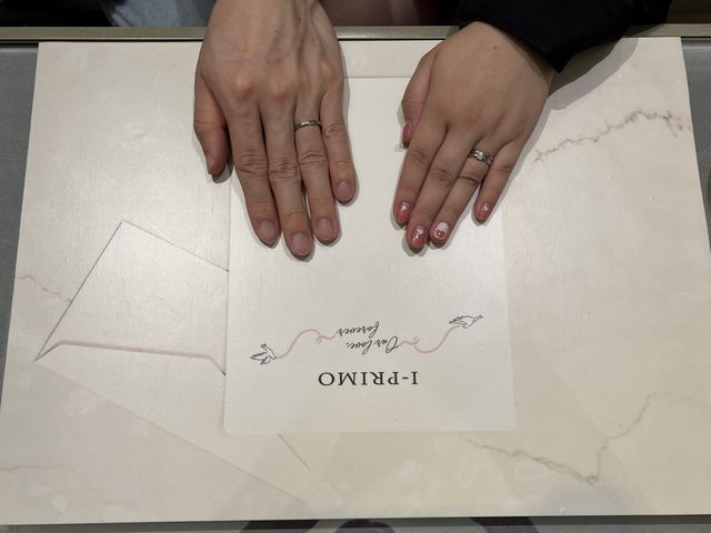 予約していたので待ち時間はゼロでした。特に良かったなと思ったのが、一通り指輪を紹介してくださったあとに、席を外してふたりで吟味する時間を作ってくださったことです。その時間でふたりでゆっくり話し合い、指輪をきめることができました。