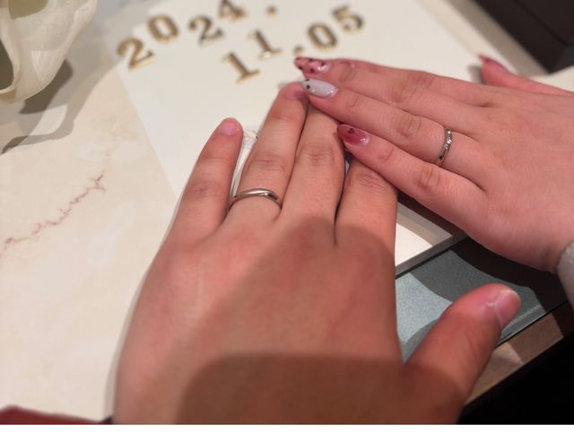 周りの人はプラチナを着けている人が多かったため指輪に特別感を感じたかったため、Promise Brownにこだわりました。お互い指が長かったため、まっすぐな指輪よりもウェーブの指輪選び指にフィットしているように感じました。