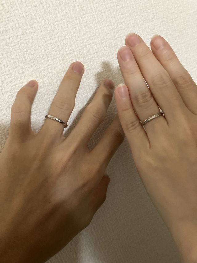 今後、何十年つけることを考え、あまり主張がなく、ただ、さりげなくこだわりが見えるデザインで、男性側も柄無しではなく、女性側と模様を合わせたようなデザインであり、ふとした時に、お互いが指輪を見た時、安心感を感じるようなデザイン。