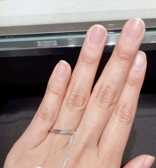 ダイヤモンドが3〜5個入っているものを検討していました。探しているものを伝えるといくつか指輪を持ってきて下さいました。ウェーブが少しかかっていてダイヤが見えつつも派手すぎないものが決め手となりました。