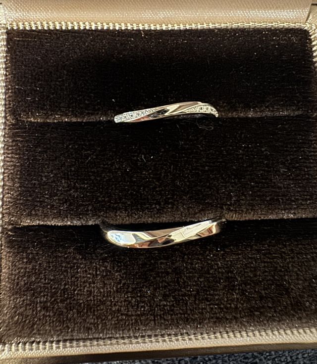 和装の前撮りで初めて着用しました!指輪が程よい細さで指が細く見え綺麗です。ダイヤモンドが10石入っているのにそこまで派手に見えず普段使いとしても十分使える指輪でオススメです。男性の方も細すぎず太すぎず良かったです。