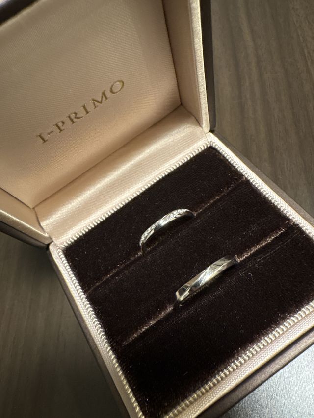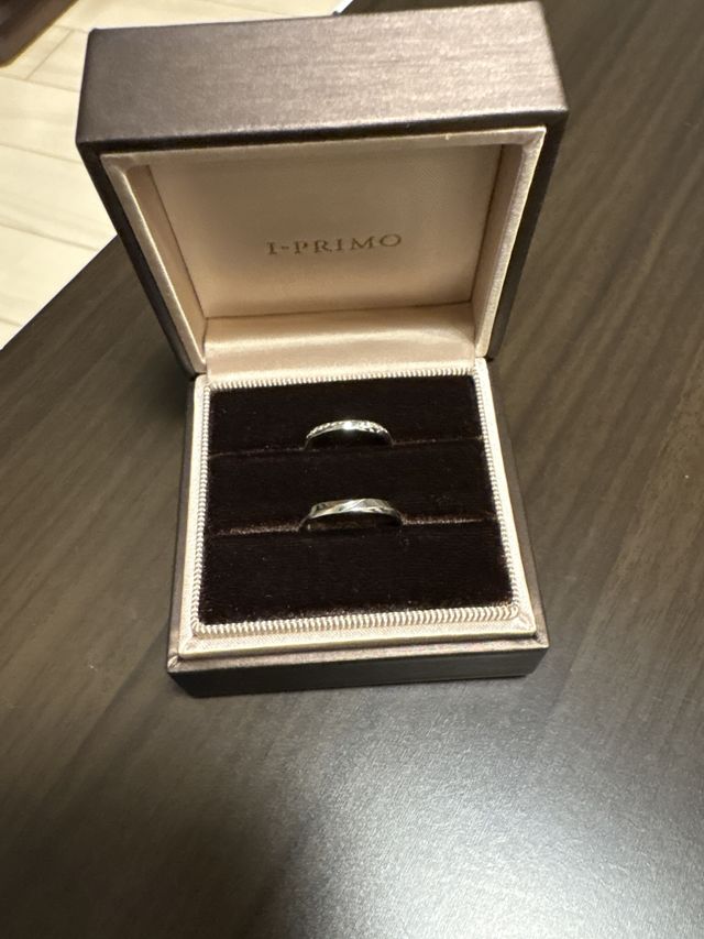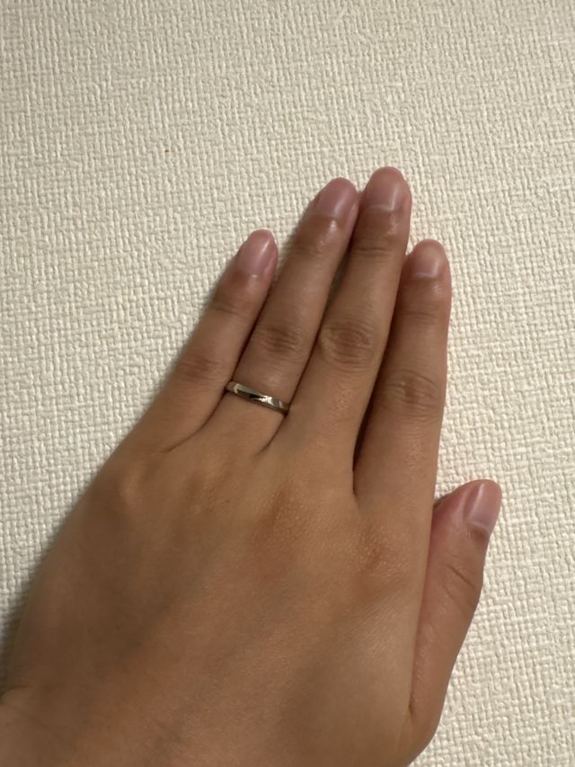 最初にお互いの指の診断をしてから自分たちに合う指輪を探しました。シンプルなストレートが似合う状態でしたが、シンプルさの中にも華やかさを持っている指輪を選びました。自分で見ても、人から見られても輝きが楽しめる指輪です。
