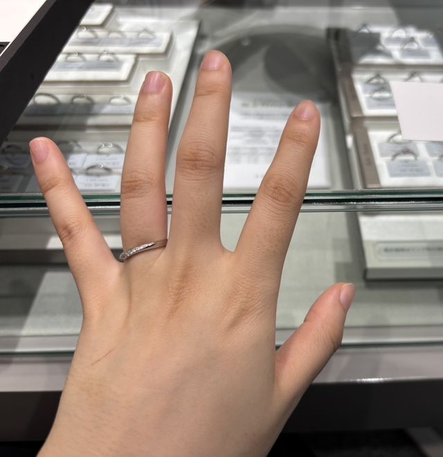 指輪の決め手は、自分達に合っているか、違和感がないか、つけていて気持ちがあがる等を色々考えたうえで一番いい指輪を選びました。シンプルなものがいいと思っていましたが、試着して指になじみ、動きがあって、つけ心地の良い指輪を選びました。