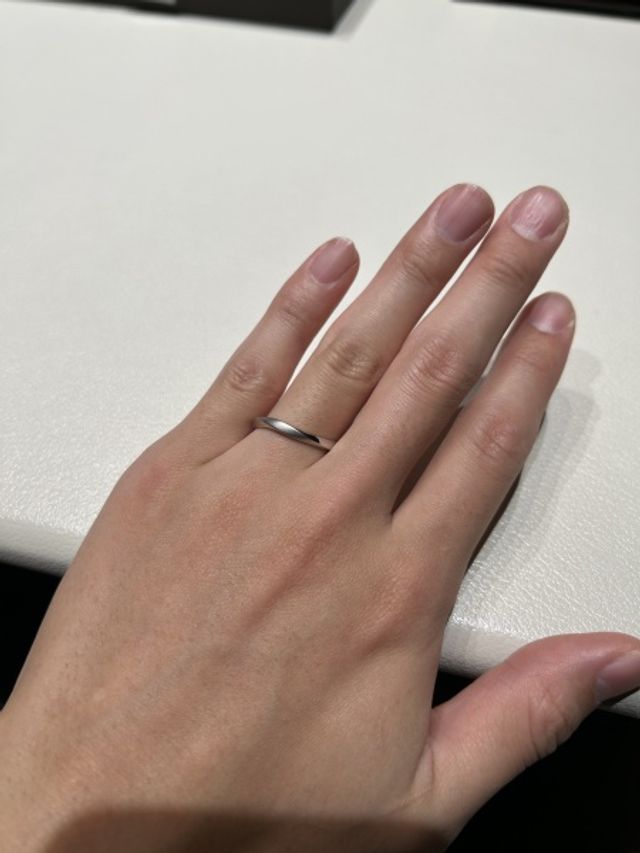 プラチナの素材でありながら、マットの部分があり少し特別感がある。ストレートのタイプ。自分の指にはウェーブがあうというように従業員の方に見ていただいたが、ストレートでも指に馴染んで、使い勝手がよさそう。