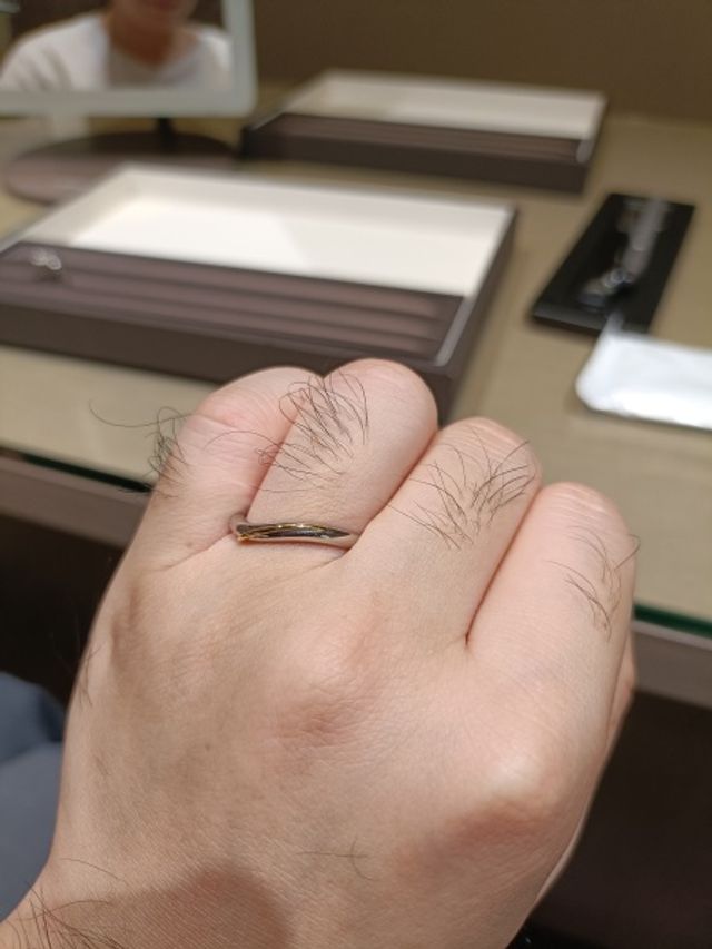 試着しただけですがV字でプラチナとゴールドのコンビのデザインは良いなと思いました。また、デザインがかっこいい印象もあったため単体だけでも目立つ指輪ではないかなと思います。薬指の付け根が斜めになっている人はV字が似合うと思います。