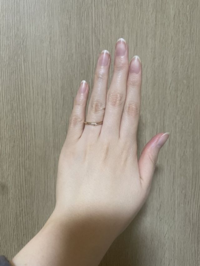 ウェーブの絶妙さが指にフィットします。中央の3子連なっているダイヤがポイントで、付けていてテンションが上がります。細目なところも、指を華奢に見せてくれて嬉しいです。