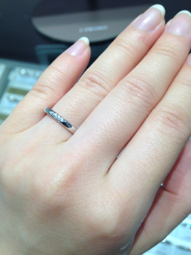ダイヤが真ん中に並んで入っており、シンプルだけど少しキラキラが欲しいという方にはぴったりだと思います。斜めに入っているデザインはよく見かけますが、並んでいるのはありそうでないデザインだと思いました。太くはないですが、細すぎることもないので、華奢な指や普通の指に似合うと思います。