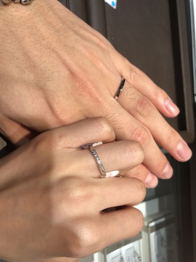 一筋のダイアが流れるように配置されていながらもシンプルで、目立ちすぎることのないデザインが気に入りました。また夫婦のペア感が感じられるデザインでもあるので、年齢を重ねても飽きることなく、夫婦仲良く使い続けれるなと思いました。