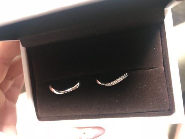 ダイヤのつきかたと、指が細く見えるウェーブしたデザインが決め手でした。ダイヤがついているものといないもので迷っていましたが、お店の方から、最近はダイヤがついているのを選ぶ方が多いとアドバイスもいただきました。
