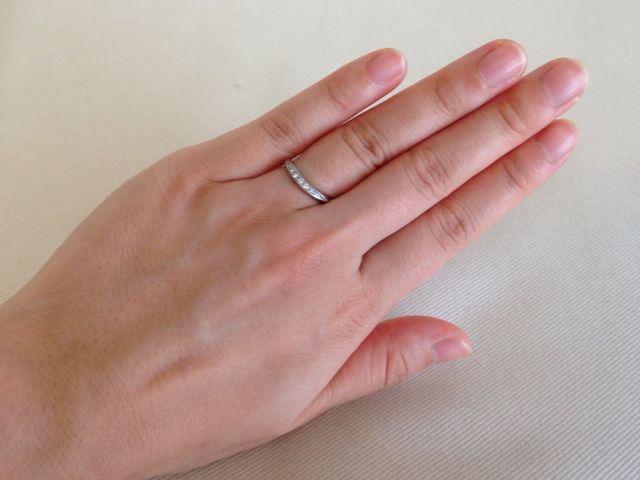 家事などで邪魔にならない様、シンプルなデザインを希望。ただシンプルすぎると寂しかったので、小さなダイヤが入っていてお洒落にもみえるところが決め手。また私の手が小さいので、なかなか似合う指輪がなかったが、ラインが斜めになっているので指がすらっと長く見えるところがお気に入り。