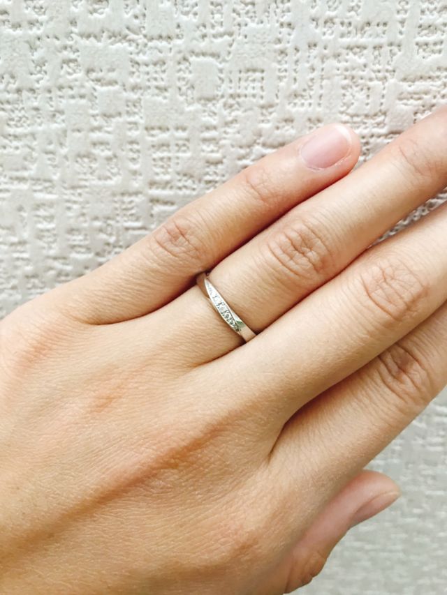 ある程度リングのボリュームがほしかったので、ちょうどいいボリューム感だったこのリングを見た時にこれだ!と思いました。自分のだけでなく男性側のリングのデザインにも惹かれペアでとても良いリングだと思い気に入りました。