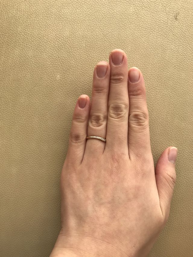 カーブのデザインが気に入りました。また、内側に石を入れられるところやカラーを選べるのがいいと思いました。手の雰囲気に合うように店員さんと夫と相談し、服の好みから似合うものを選んだ結果これに決めました。