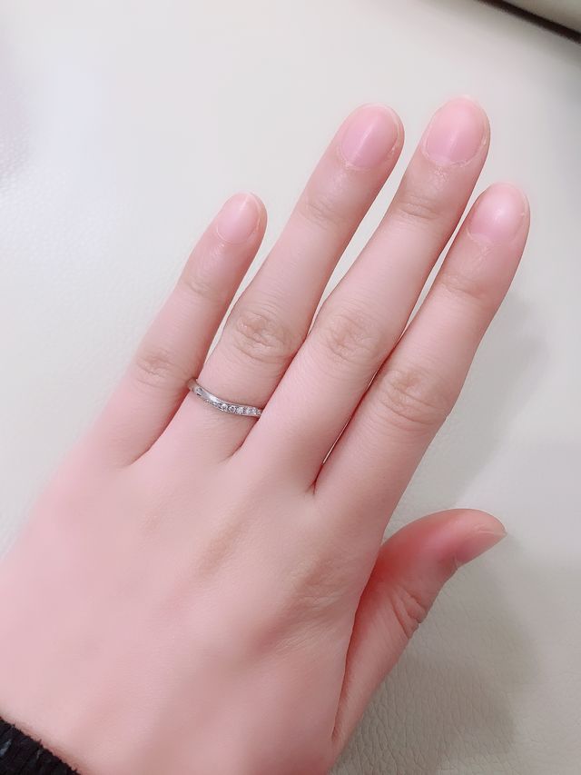 デザインがウェーブのものが指が長く見えるそうなので、強すぎないウェーブのものであること、ダイヤが付いていてキラキラしているもの、結婚指輪と重ね付けができるものを条件にしていたので、それを満たしたものを購入しました。