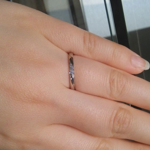 私の手の形を見てストレートタイプのものが良いのではとの事だったので、シンプルで着用しやすいストレートタイプのリングを選びました。ダイヤモンドは埋め込まれておりリング全体の表面が滑らかで引っかかりがないのも良かったです。