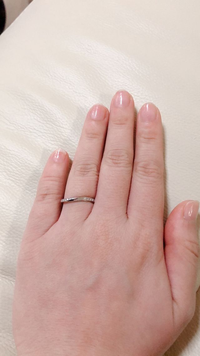 指が太く短いので、元々V字のものしか考えていませんでした。いろいろなV字を着けさせてもらって、いちばん指輪が太すぎず、細すぎず、それなりに存在感をもっているものがこれでした。ねじれている感じがとてもオシャレです。
