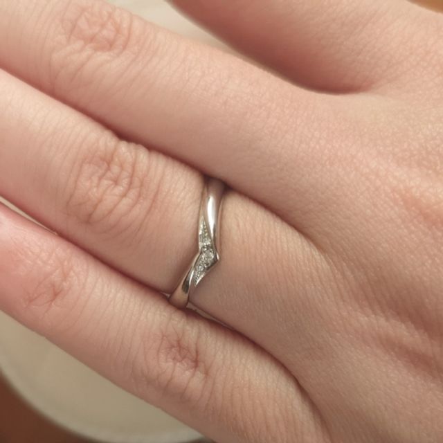V字のラインがハッキリと出ており、指がすっきりとした印象で綺麗に見える効果があるようです。メレダイヤの部分がハートの形にも見える部分が気に入っていますし、メレダイヤの輝きも綺麗で全体的に上品な存在感あり良いと思います。