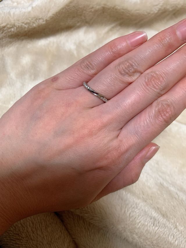 細身でウェーブ、ダイヤがラインでついているデザインのものをずっと探してました。デザインにペア感がしっかりあるところもポイントが高かったです。いろいろと見たのですが、これを見たら一目惚れしてしまいました!!