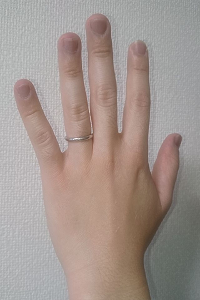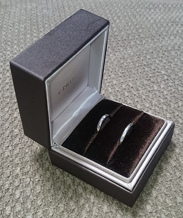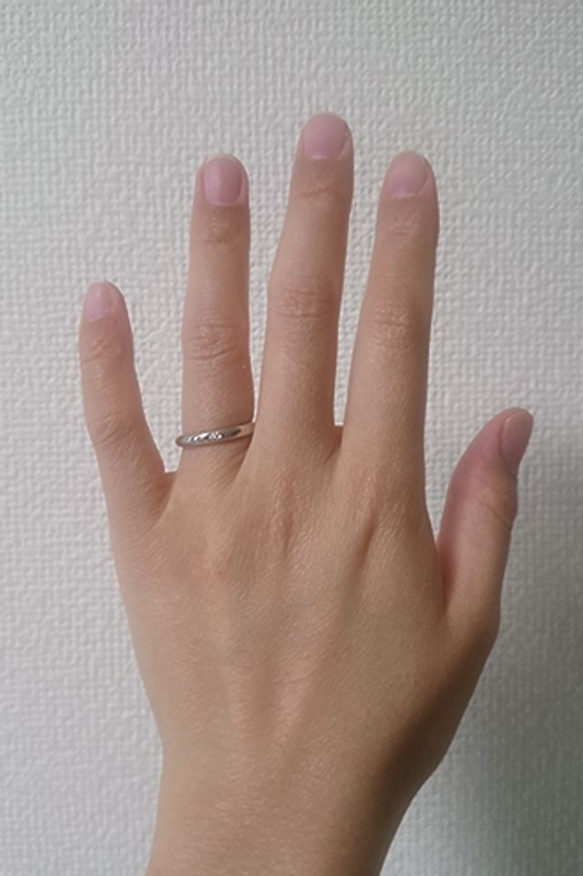 丸みのあるデザインが私の少し短めな指にマッチします。中央の小さな窪みに埋められたさりげない一粒ダイヤは角度を変えるとキラキラ輝いて見るたび嬉しくなります。年を取っても似合うように、どんな服装にも合うように素材はプラチナにしました。