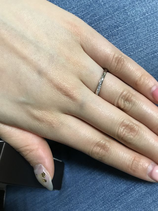 360度、どの角度から見てもダイヤモンドが輝いているのがわかるところがいいなと思います。ダイヤモンドの配列も指の形に合って一般的なものとは逆の左下がりに並んでいるので、それがまた指を綺麗に見せてくれると思います。