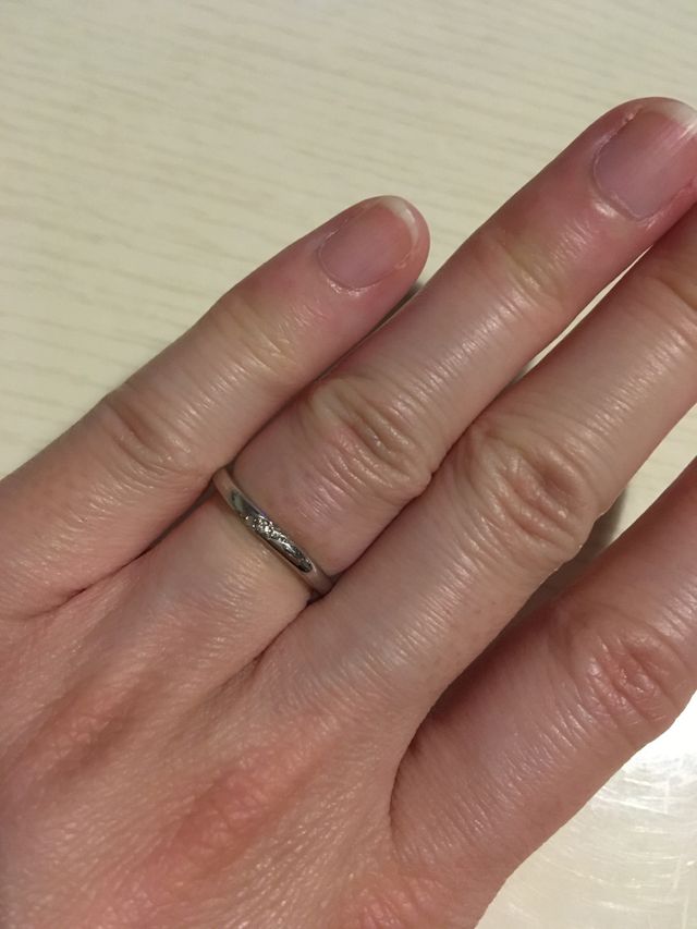 私も旦那さんも指が細めなので、元々アームが細めのストレートタイプの指輪を探していました。こちらの指輪はダイヤモンドが強調されすぎず、シンプルなデザインで旦那さんが一目惚れしました。一見ダイヤモンドなしの指輪のようにも見えますが、メインの一石の横にはメレダイヤが埋め込まれています。そのメレダイヤモンドがアームの上下からも見える珍しいデザインが私も気に入り、こちらの指輪を購入