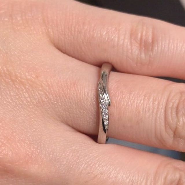シンプルなストレートラインではなくウェーブの入った形の為、指がきれいに見えるのが気に入りました。またメレダイヤがたくさん散りばめられており、波のきらめきを感じさせて素敵ですね。全体的には上品なシルエットです。